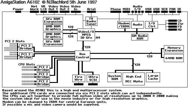 In the accompanying pictures I have drawn a series of designs of potential Amiga type computers. They are based around a PowerPC or DEC Alpha CPU and a powerful partial custom chip called the A4. Additional chips would also feature but most if not all would be standard off the shelf components.
