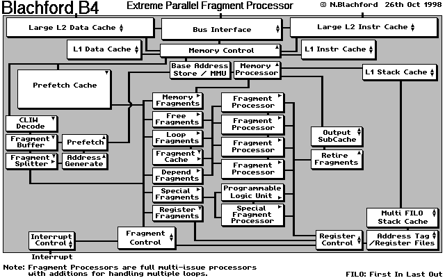Although below I say implementation I don't mean this in the usual sense. The B4 is a hypothetical architecture and as such is really only a vehicle for my ideas on microprocessor architecture. This design is not set in stone, rather it could be considered at freshly poured wet cement. If someone was to go and try and actually build one it would probably end up looking very different from what I describe here with more ideas being added and some being removed. For example asynchronous operation of the Fragment Processors is probably necessary for high speed but the split clock they use may actually hinder things.
