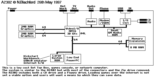 At the very low end is the A2302 which is pretty much a cut down A2402 with a lower price tag. The system would be competing against consoles but by providing an internal modem along with a keyboard and floppy drive would provide the lowest cost route onto the Internet as well as a means to save users downloaded data. This system would also provide a very good set top box or Network computer.
