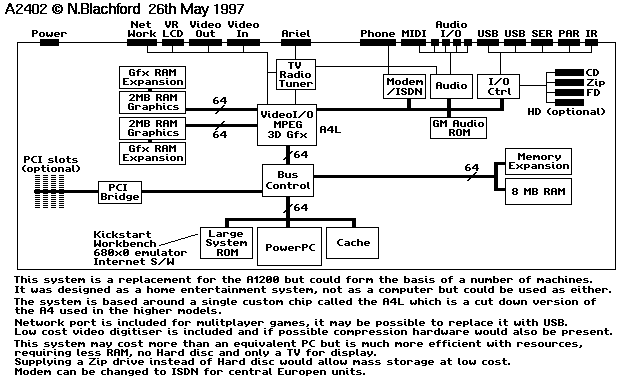 This is the replacement for the A1200, lower A4000s and forms the basis of the entire range. It is based around a PowerPC CPU and a lower end version of the A4 called the A4L. The remaining components will all be standard off the shelf parts with the possible exception of one bus controller. Rather than an expansion port PCI slots can be included but these may not be included in some versions. As with all models there is a choice of internal modem or ISDN connection, the modem would be included in UK and US models but switched for ISDN on other European models. There is no standard Hard Disc on the A2402 but a Zip drive could be included in some models as well as the standard CD and floppy. The entire AmigaOS would be included in a large system ROM. This would replace A1200 type machines but may come in at a slightly higher price.