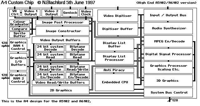 This is a new partial custom chip to replace the existing Amiga chip set, it would not however be compatible with the existing chip set. It will come in two versions, the full A4 and the lower cost A4L. There would be little internal difference but the 3 main bus systems are 128 bit on the A4 and 64 bit on the A4L, the I/O bus is the same on both. The A4 is designed primarily for graphics but it also includes a music synthesiser and an embedded CPU which controls the Input / Output bus for the system. These are only low bandwidth applications and do not use the Graphics busses. They are likely to have minimal impact on the graphics performance of the chip.
