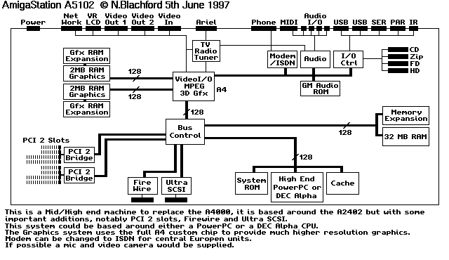 In the accompanying pictures I have drawn a series of designs of potential Amiga type computers. They are based around a PowerPC or DEC Alpha CPU and a powerful partial custom chip called the A4. Additional chips would also feature but most if not all would be standard off the shelf components.